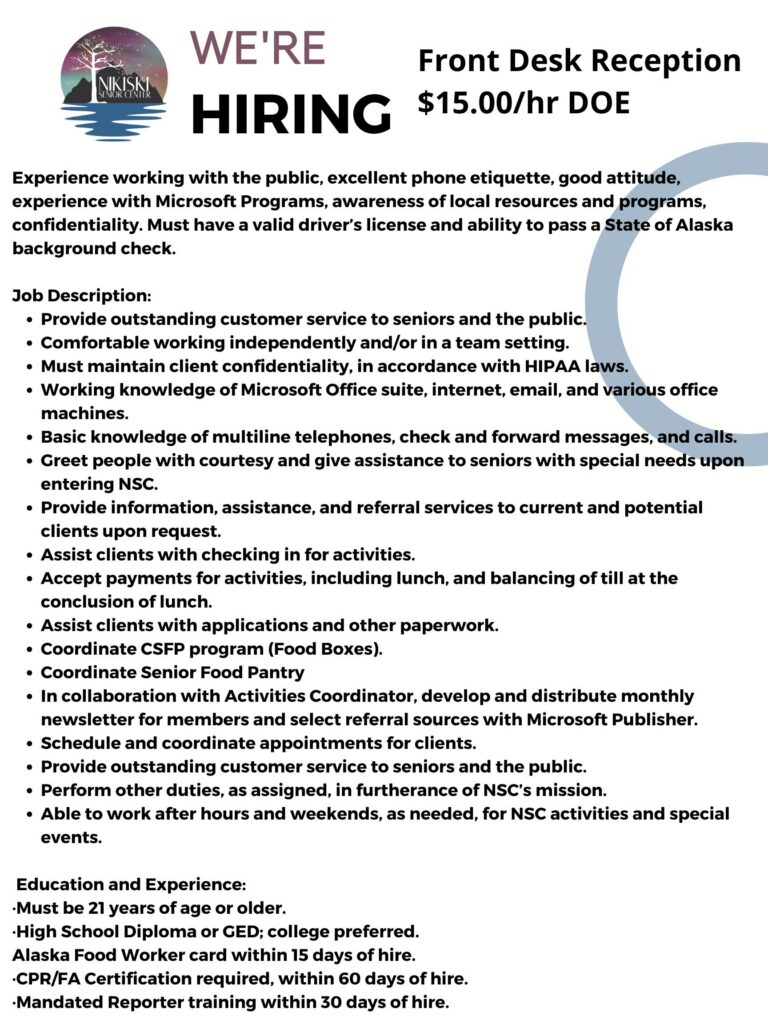 The purpose of the Nikiski Senior Center is to make available programs and services that enhance the personal well-being and enjoyment of life for our older citizens in the Nikiski area.