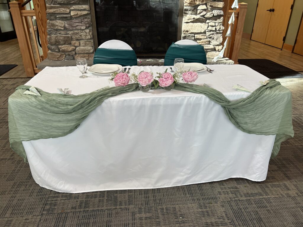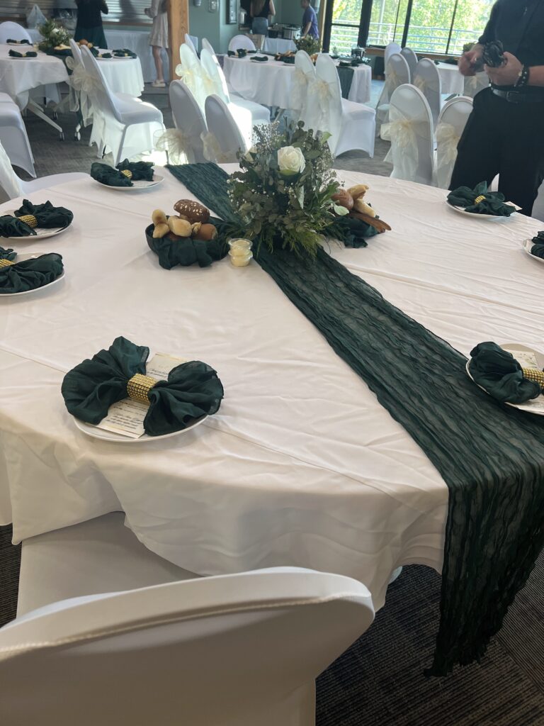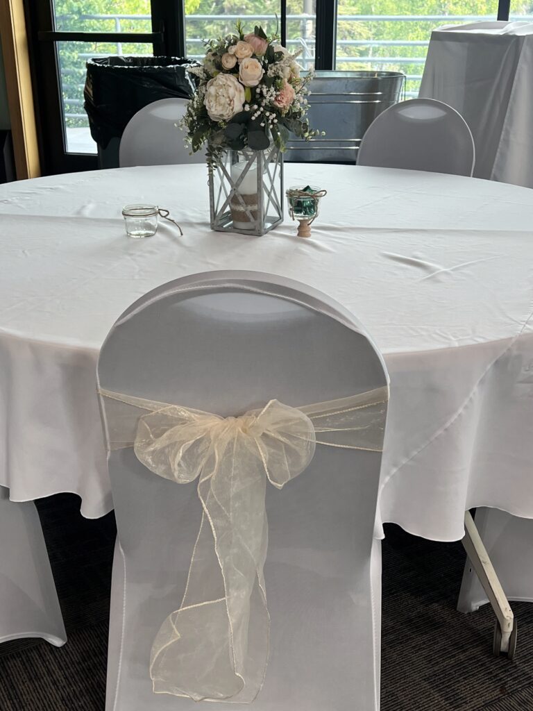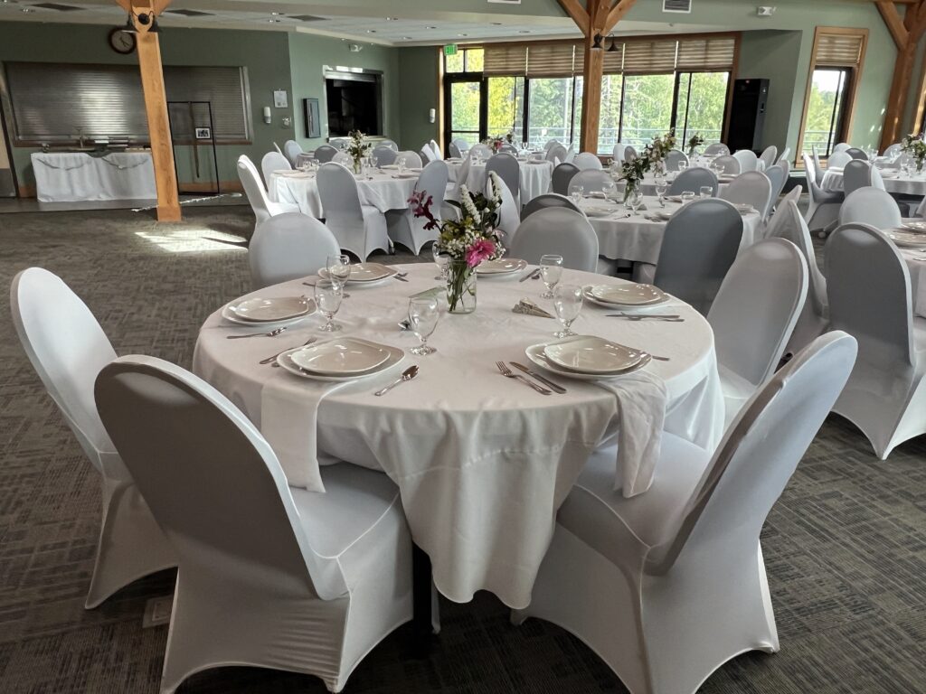We offer a selection of different sizes and types of rooms, tables in four sizes, chairs (both indoor and outdoor), linens (White, Black, Navy Blue or Red), and place settings, making your venue planning seamless and easy.